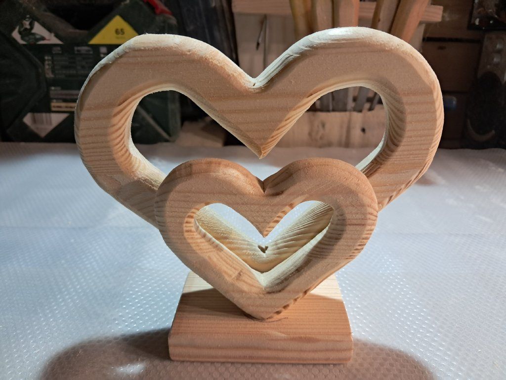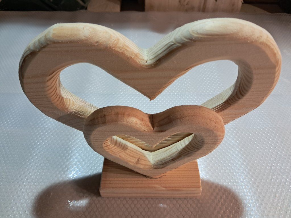 2 krásne srdcia vyrobené zo smrekového dreva s podstavcom